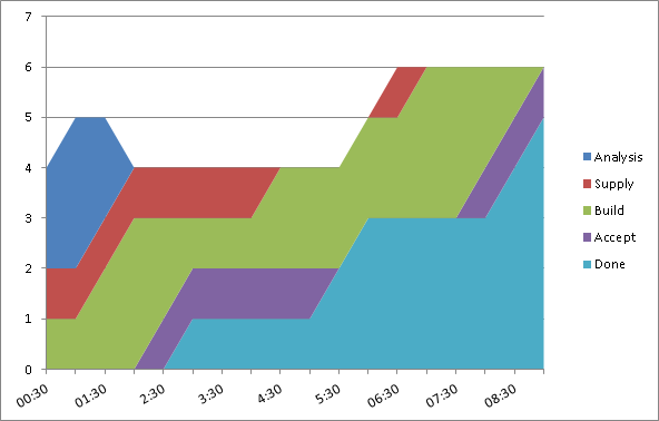The first items were delivered after 3:00 and you can the regular delivery intervals at 6:00 and 9:00, typical of a time-boxed approach.